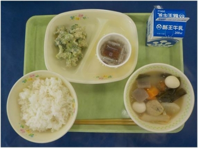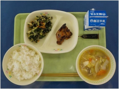 2017年1月12日 08時19分ごはん 牛乳 ミルメーク 鶏肉のみそ焼き ほうれん草と春菊のごまあえ けんちん汁