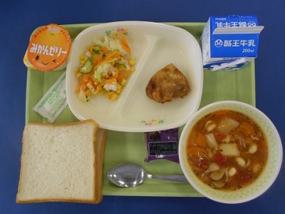 食パン 牛乳 ブルーベリージャム タンドリーチキン コールスローサラダ ミネストローネ