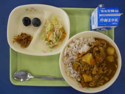 2016年9月23日 12時06分 なすカレーライス・牛乳・福神漬け・糸かまサラダ・ぶどう
