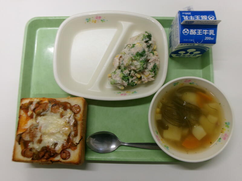 手作りピザトースト 牛乳 ブロッコリーとツナのサラダ コンソメスープ