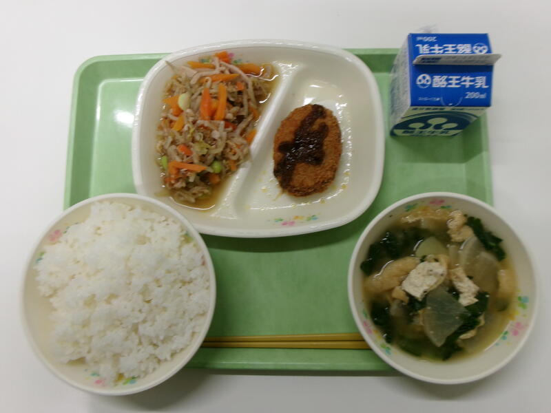 ごはん 牛乳 キャベツメンチ 人参しりしり ほうれん草のみそ汁
