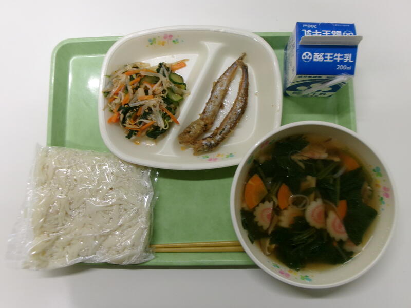 肉うどん 牛乳 ししゃもの唐揚げ ピリ辛野菜あえ