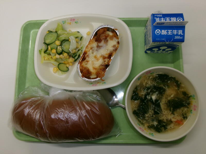 黒糖パン 牛乳 手作りミートグラタン コーンサラダ むらくもスープ