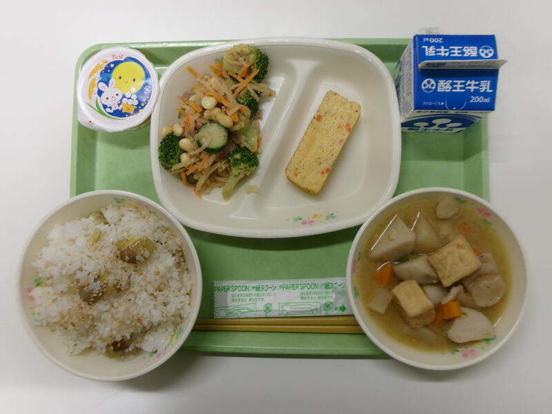 栗ごはん 牛乳 五目厚焼き玉子 豆のサラダ いりどり 十五夜デザート
