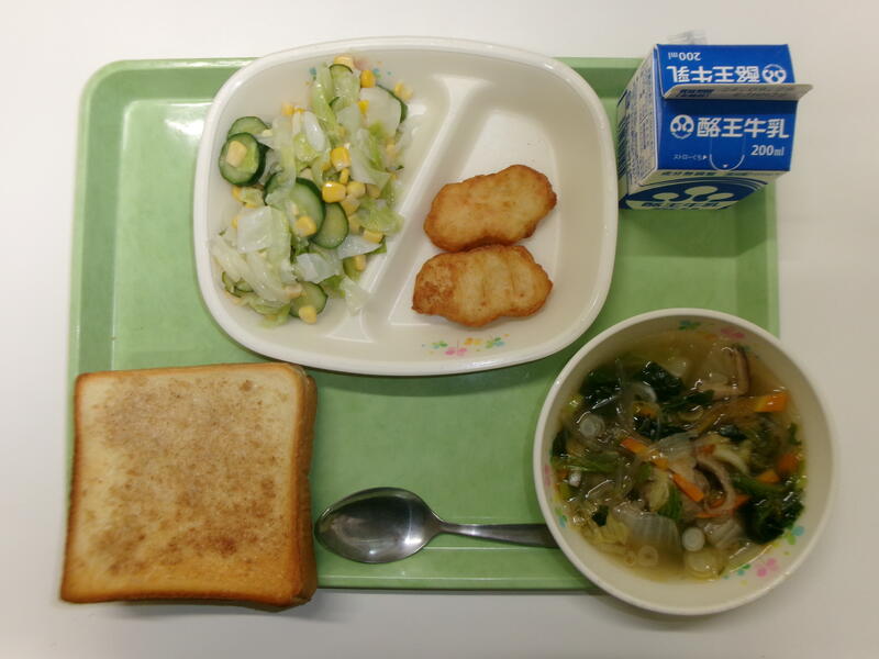 手作りセサミトースト 牛乳 豆腐のナゲット コーンサラダ 白菜と肉団子のスープ