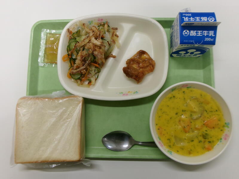 食パン 牛乳 県産梨ジャム タンドリーチキン オニオンチップサラダ パンプキンシチュー