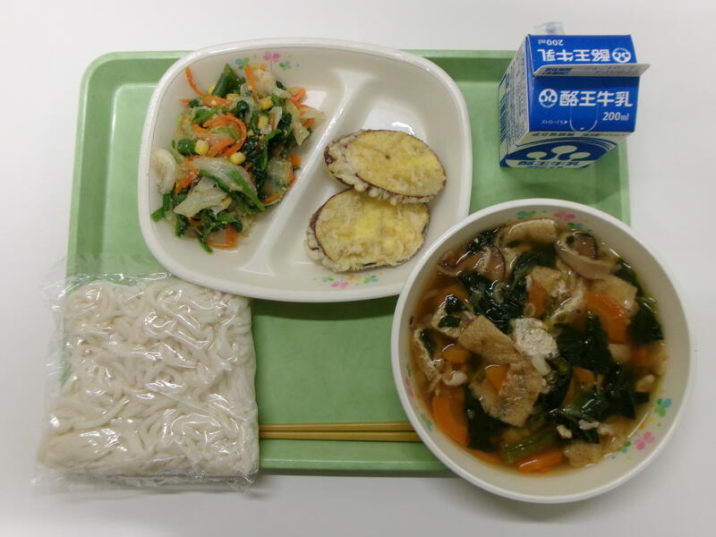 きつねうどん 牛乳 さつまいもの天ぷら 野菜のごまみそあえ