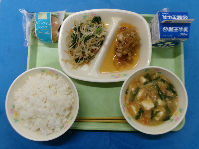 ごはん 牛乳 油淋鶏 もやしのラー油あえ 麻婆豆腐 シューアイス