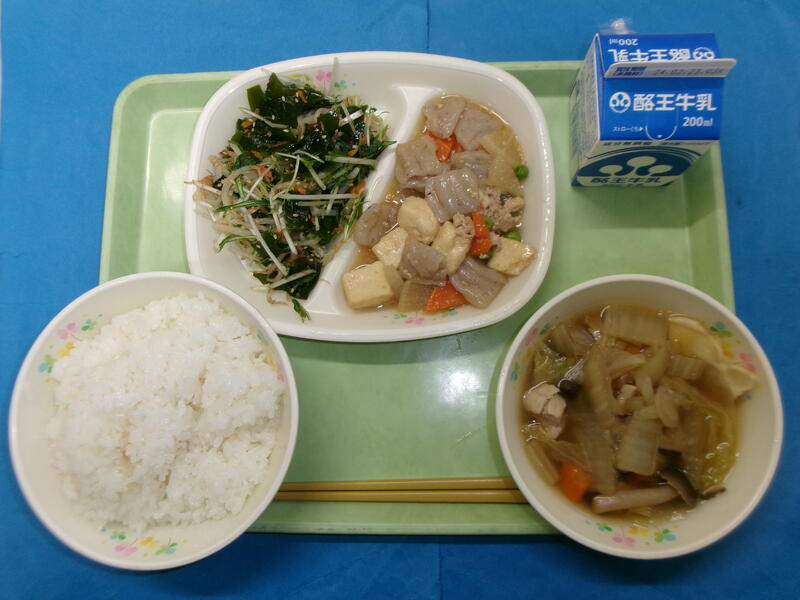 ごはん 牛乳 生揚げのそぼろ煮 もやしとわかめの土佐酢あえ せんべい汁