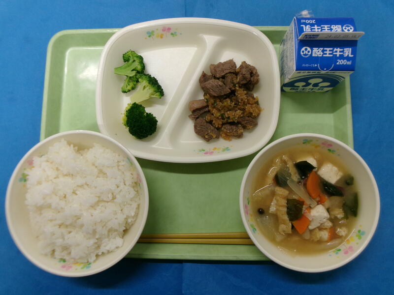 ごはん 牛乳 サイコロステーキ ゆでブロッコリー さつまいものみそ汁