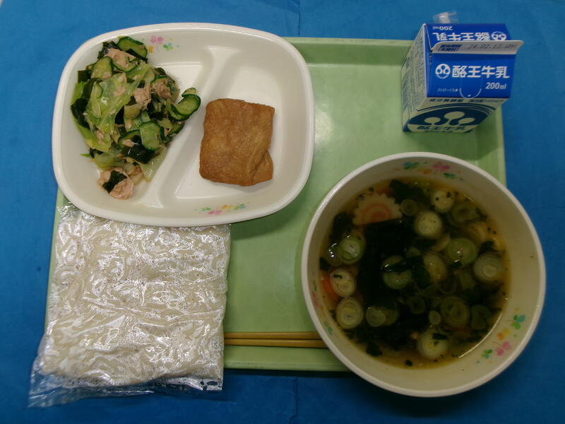 力うどん 牛乳 もちいなり わかめとツナのあえもの