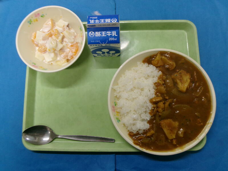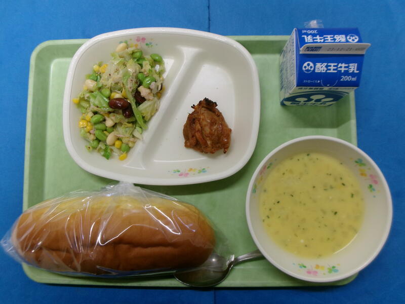 かぼちゃパン 牛乳 タンドリーチキン 豆のサラダ コーンポタージュ