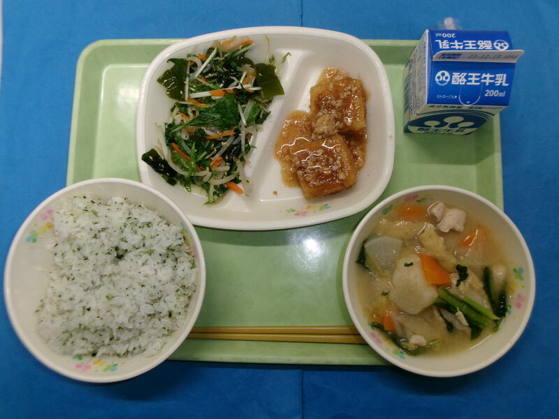 若菜ごはん 牛乳 揚げ出し豆腐 もやしとわかめの土佐酢あえ すいとん汁