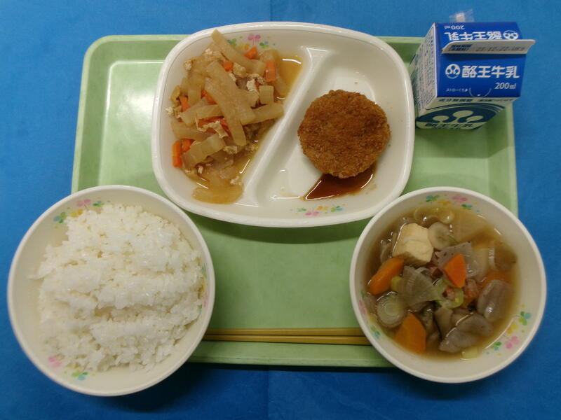 ごはん 牛乳 キャベツメンチカツ ひきな炒り 八杯汁