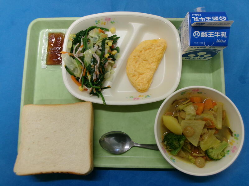 食パン 牛乳 いちごジャム チーズオムレツ ほうれん草サラダ カレーポトフ