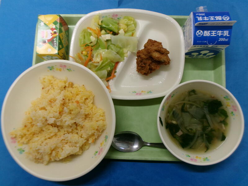 キャロットピラフ 牛乳 フライドチキン チーズサラダ オニオンスープ クリスマスケーキ