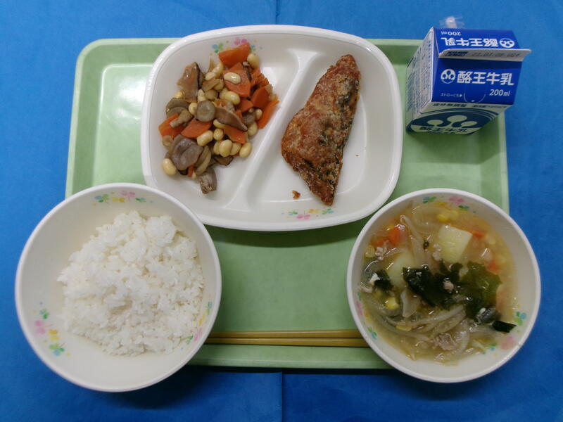 ごはん 牛乳 さばの竜田揚げ 五目豆 具だくさん汁