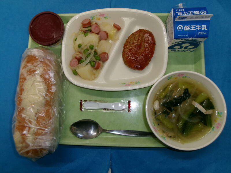 アーモンド揚げパン 牛乳 ハンバーグ ジャーマンポテト オニオンスープ