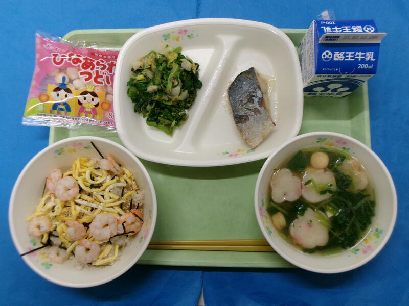 ちらし寿司 牛乳 さわらの西京焼き 菜の花のおひたし すまし汁 ひなあられ