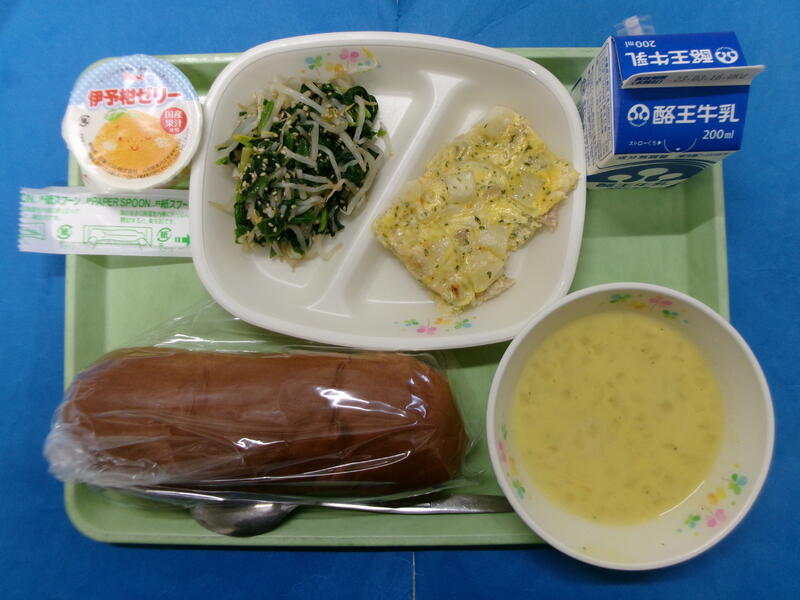 黒糖パン 牛乳 手作りポテトオムレツ ほうれん草のサラダ コーンポタージュ
