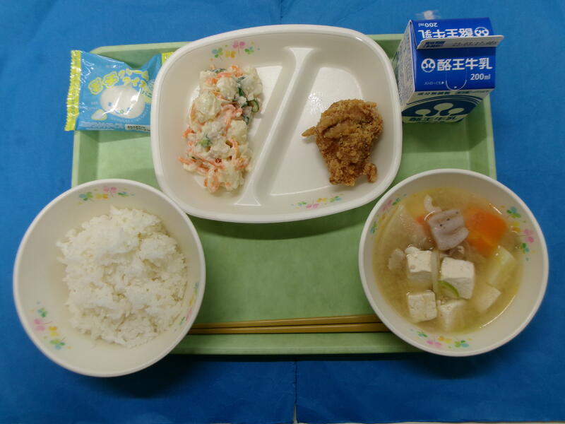 ごはん 牛乳 からあげ ポテトサラダ 豚汁 大福アイス