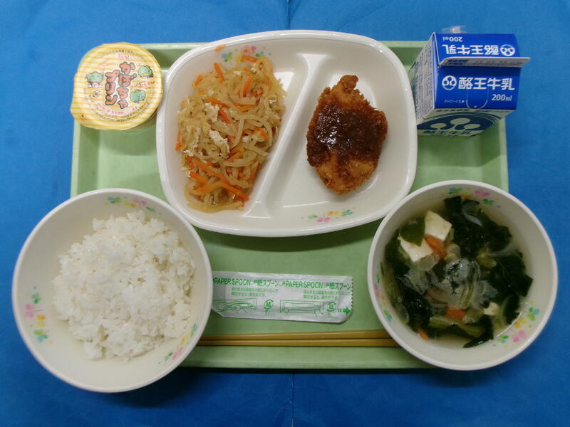 ごはん 牛乳 手作りチキン味噌カツ ひきな炒り 豆腐の味噌汁 かぼちゃプリン