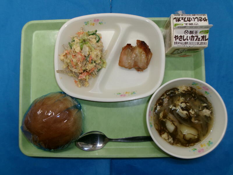米粉パン カフェオレ牛乳 照り焼きチキン ごぼうサラダ もずくスープ