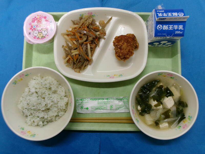 若菜ご飯 牛乳 鶏の唐揚げ 五目きんぴら じゃがいもの味噌汁 お祝いいちごゼリー
