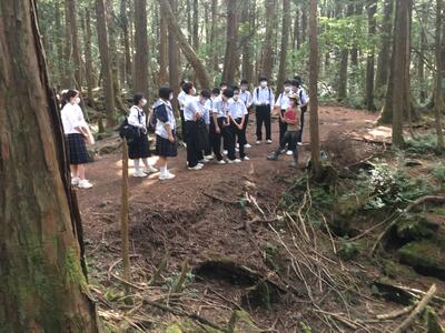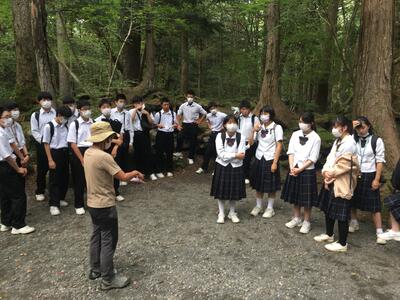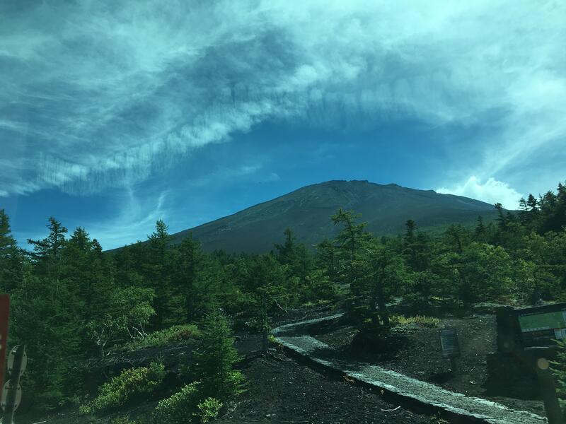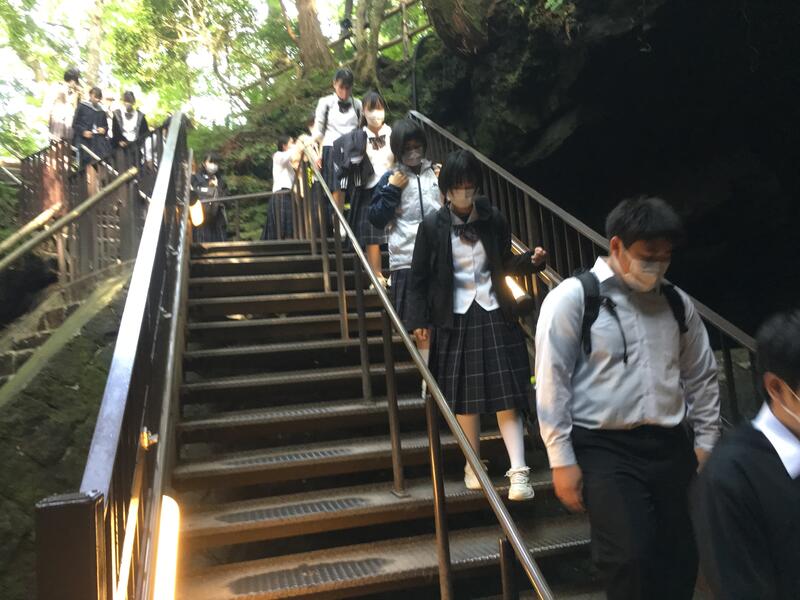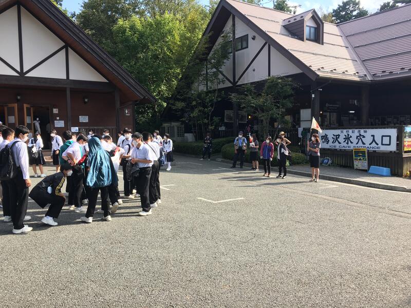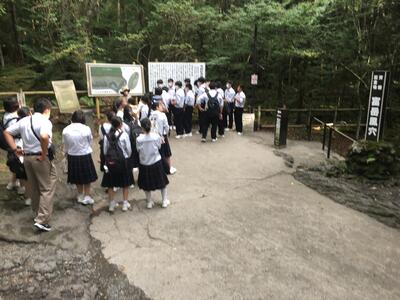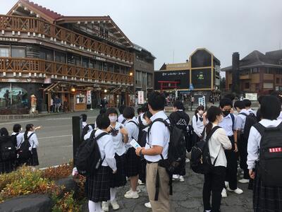 富士山五合目に、12:00過ぎに到着しました。学級ごとに記念撮影をし、昼食をとったあと、レストハウスで買い物をしたりする自由時間となります。昼食は、山梨県の郷土料理の「ほうとう」を中心としたメニューでした。みんな元気に食べていました。五合目レストハウス前からは、時々富士山の山頂が顔を出すこともありました。出発は14:00の予定です。