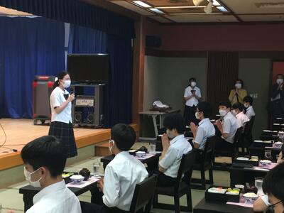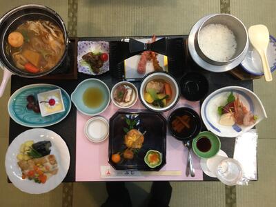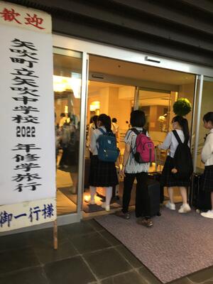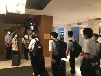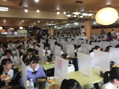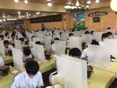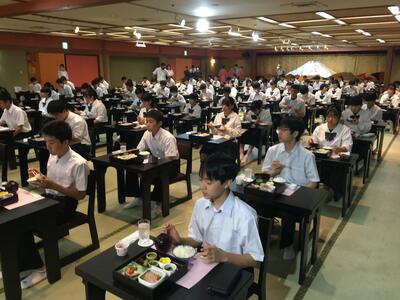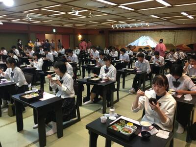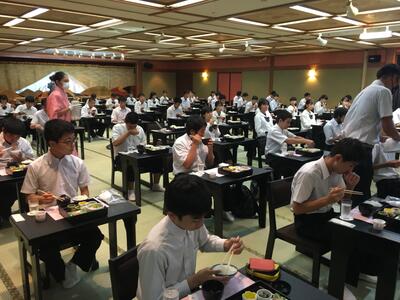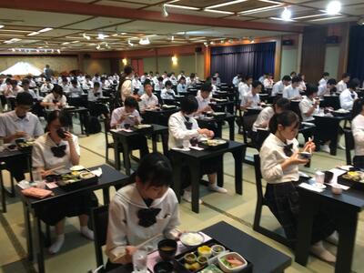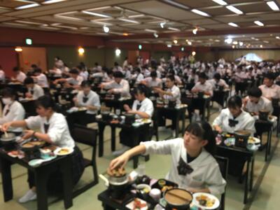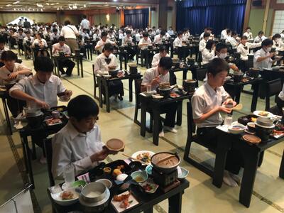 今日は一日中時間を守って生活でき、立派でした。夕食も時間どおり18:10にスタート。いろいろな料理を十分に味わいお腹いっぱいになりました。食後に、7時から8時まで貸し切りの大浴場に友達と楽しそうに向かう生徒もいました。あとは明日の予定を楽しみにしながら、ぐっすり眠るだけです。おやすみなさい。