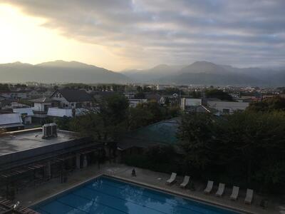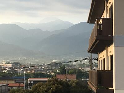 おはようございます。今日の甲府盆地は晴れです。ホテルの窓から薄っすらと富士山が見えました。朝食時間になると、みんな続々と会場に入って来ました。検温と手指消毒です。誰に言われることなく靴を揃えます。あいさつをしていただきます。食事の後、準備を整えて予定どおり8時にホテルを出発しました。 全員元気です。