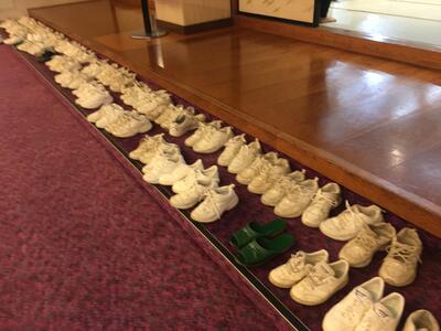 2022年9月15日 07時20分おはようございます。今日の甲府盆地は晴れです。ホテルの窓から薄っすらと富士山が見えました。朝食時間になると、みんな続々と会場に入って来ました。検温と手指消毒です。誰に言われることなく靴を揃えます。あいさつをしていただきます。食事の後、準備を整えて予定どおり8時にホテルを出発しました。 全員元気です。