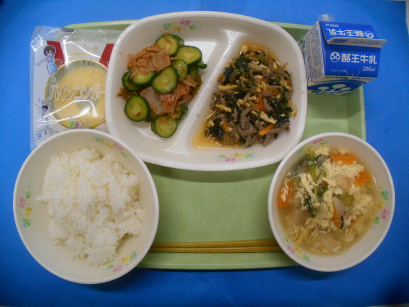 ビビンバの献立 2022年7月14日 11時53分 続きを読む ビビンバ 牛乳 キムチきゅうり トックスープ パインコンポートーひとくちメモービビンバは、韓国の料理です。おいしく味付けした肉と野菜のそれぞれの食感が混ざり合っています。 閉じる