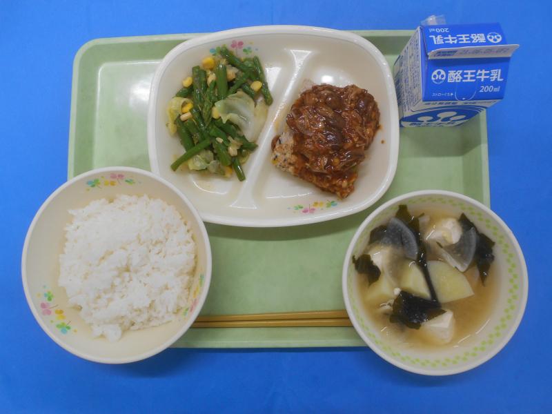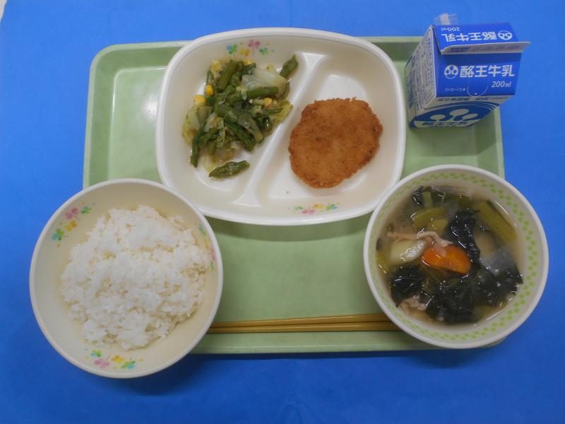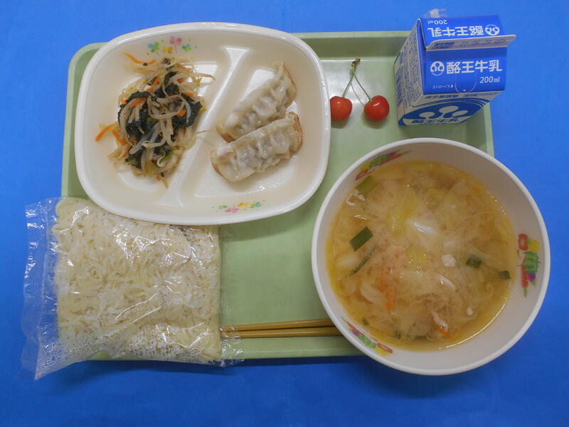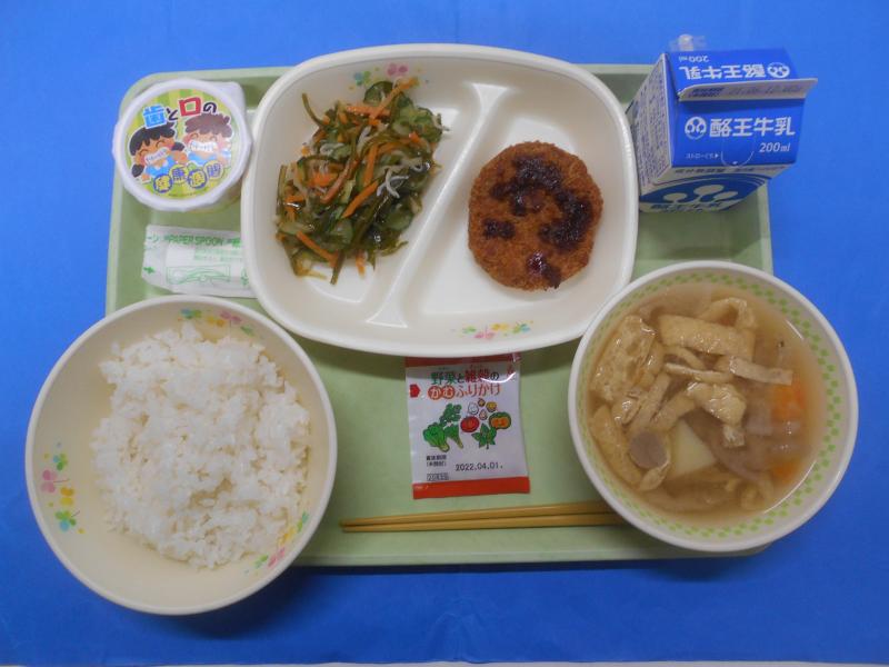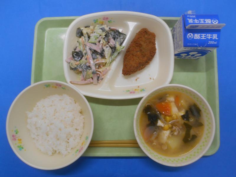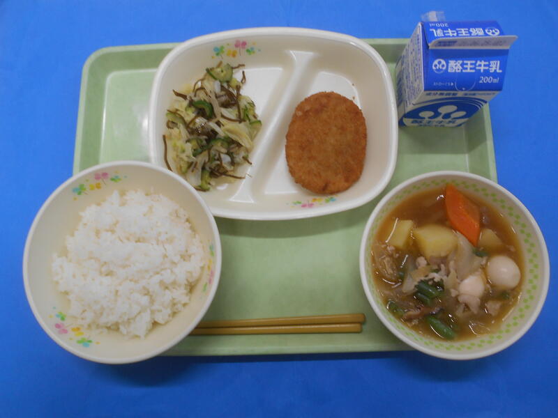 むし歯予防にちなんだ献立 2021年6月4日 13時16分 続きを読む ごはん 牛乳 ふりかけ メンチカツ カミカミサラダ 根菜汁 カムカムゼリー―ひとくちメモー今日は、虫歯予防にちなんだ献立です。いつもよりよくかんで食べる食材がたくさん使われています。よくかむことは、脳の働きをよくしたり、唾液がたくさん分泌されて消化を助けたりと体によいことがたくさんあります。 閉じる