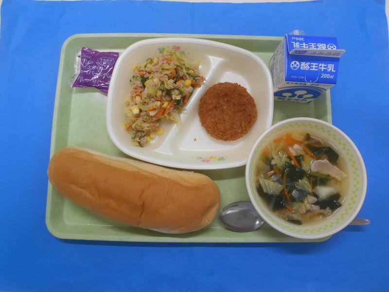 コッペパン 牛乳 ブルーベリージャム プレミアムカレーコロッケ ツナサラダ 野菜スープ