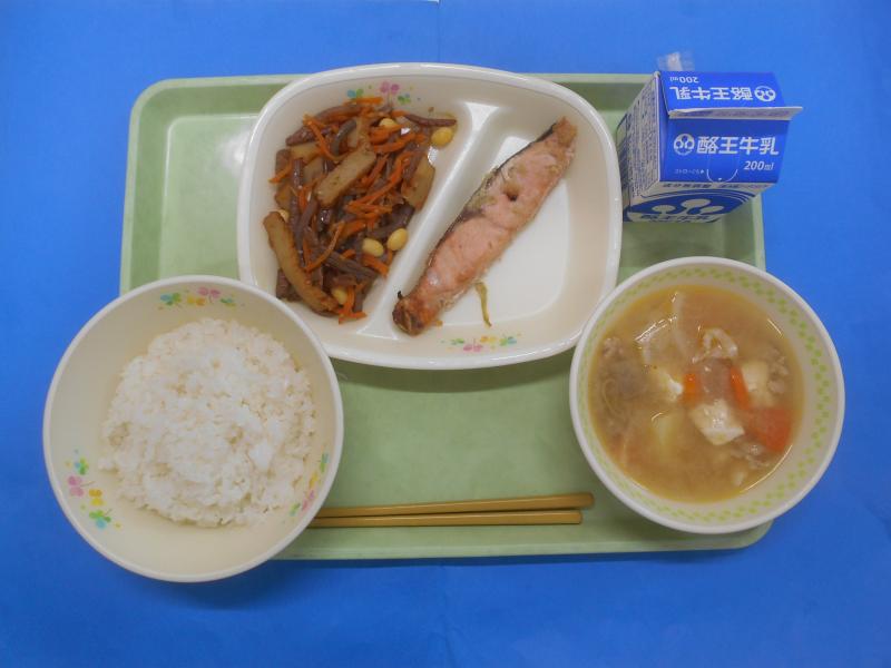 2021年4月22日 09時17分ごはん 牛乳 さわらの梅みそ焼き 切り干し大根の炒り煮 すいとん汁