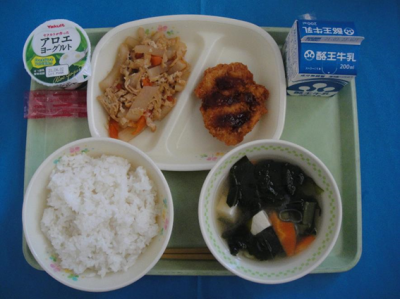 ごはん 豆腐のみそ汁 手作りチキンみそカツ ひきないり アロエヨーグルト 牛乳