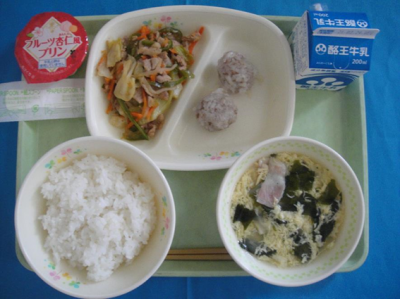 ごはん 卵スープ 肉だんごのもち米むし ホイコーロー フルーツ杏仁風プリン 牛乳