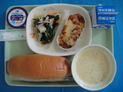 黒糖パン コーンポタージュ 豆腐のミートグラタン 青じそサラダ ブルーベリーゼリー 牛乳