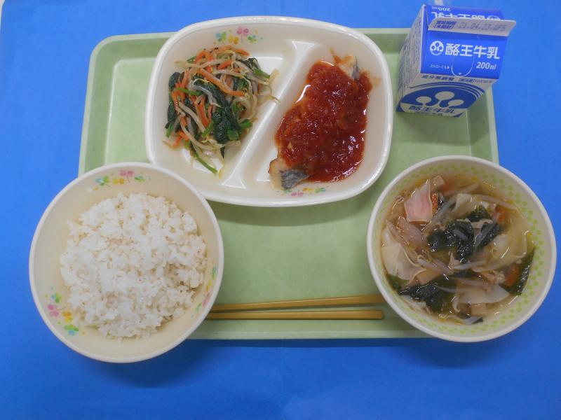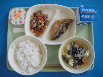 今日の給食は主食・主菜・副菜・汁物がそろった、朝食モデル献立です。