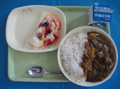 ビーフカレーライス(麦ごはん) フルーツヨーグルトあえ 牛乳