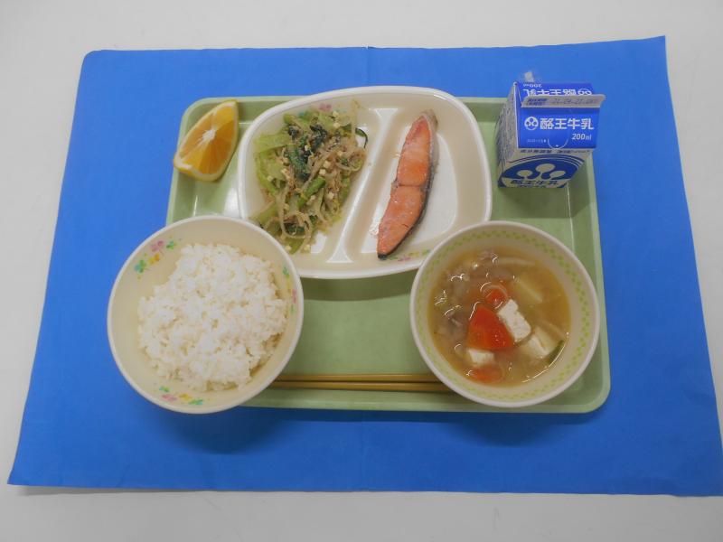 ごはん 牛乳 鮭の塩焼き 小松菜のチーズ和え 豚汁 河内晩柑(ジューシーフルーツ)