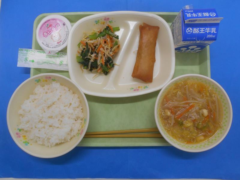ごはん 牛乳 春巻き ナムル 肉みそスープ 杏仁豆腐