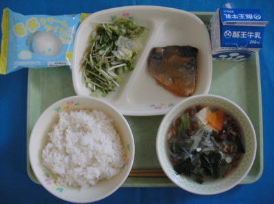 ごはん なめこ汁 さばのみそ煮 水菜のサラダ モチクリームアイス 牛乳