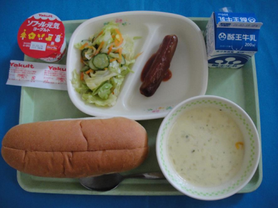 今日は特製ケチャップソースを給食室で手作りしました。コッペパンにウインナーとサラダをはさんで、手作りソースを味わいながら、きれいにいただきましょう。