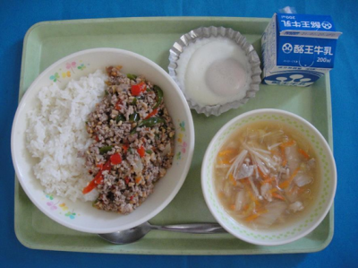 ガパオライス タイ風白菜スープ カップエッグ 牛乳