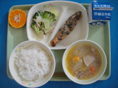 ごはん 豚汁 さけの三味焼き ブロッコリーサラダ ポンカン 牛乳