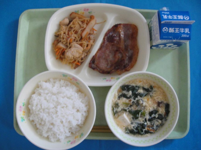 今日は昭和44年頃の給食を再現したメニューです。フォークがないため、はしで上手にスパゲティミートソースを食べてくださいね。明日は、給食の始まりとされる明治22年の給食を再現したメニューです。お楽しみに・・・!