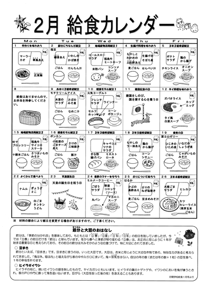 節分といえば、2月3日でしたが、今年は1日早い今日2日が節分です。2日が節分となるのは、明治30年以来124年ぶりです。今日の給食には節分ににちなんで、「いわし」と「大豆」を使った料理にしました。鬼を追い払うことができるように、今日の給食をしっかり食べてほしいと思います。