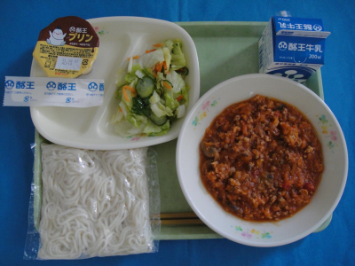 スパゲティミートソース フレンチサラダ たまごプリン 牛乳